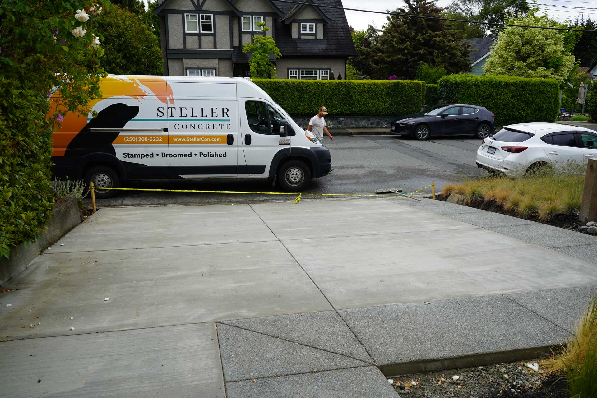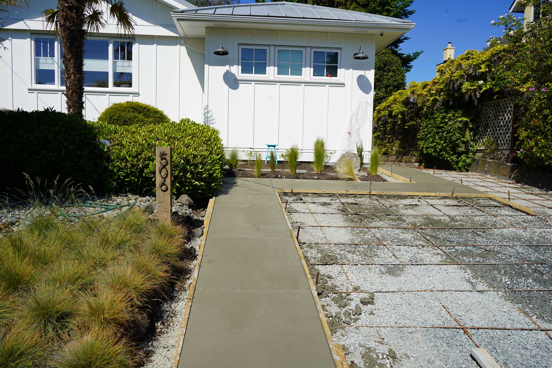 With the forms set and the site prepared, we moved into placing the concrete. The California broom finish was applied carefully to create a uniform, textured surface that works well in wet and dry conditions. The exposed aggregate walkway was washed to reveal the natural stone within the mix. This created a subtle contrast that complements the broom finished driveway and enhances the overall appearance of the property. These techniques come together to create a driveway with exposed aggregate that feels balanced, modern, and right at home in this Oak Bay setting.