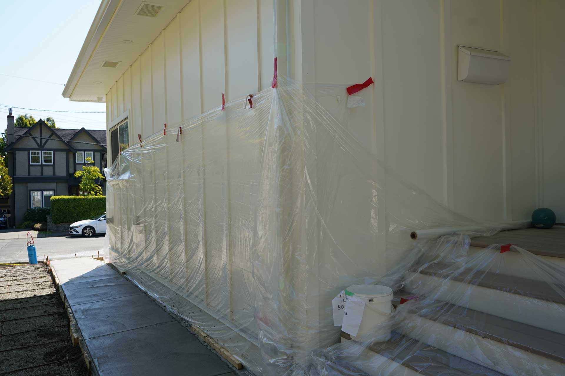 With the subgrade finalized, our team installed ten millimetre rebar at two foot spacing. Reinforcement increases tensile strength and helps the concrete adapt to everyday use. It also ensures the slab performs as intended through seasonal changes and regular household traffic. Before the pour, we protected the home with poly sheeting to keep siding, trim, and landscaping clean throughout the work.
